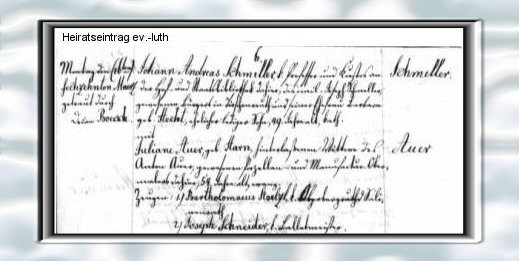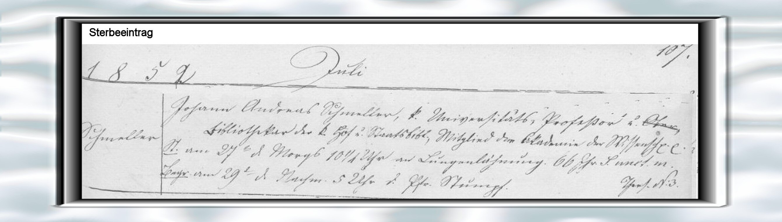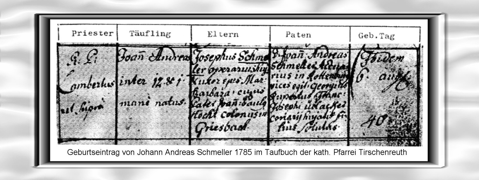 Taufpate: Dr. Johann Andreas Schmeller, Stadtschreiber in Rottenburg [an der Laaber -in Abwesenheit-], Vizetaufpate war Georg Ruppert, lediger Sohn des hiesigen [von Tirschenreuth] Gerbers Franz Joseph Üblacker.