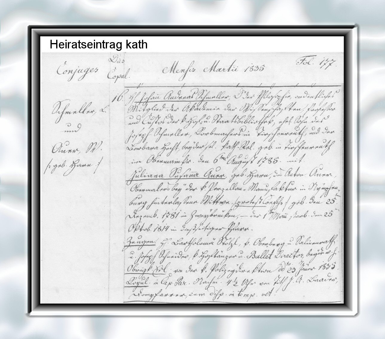 Die Trauung fand statt:, a) nach katholischem Ritus in der Sakramentskapelle des Münchener Liebfrauendoms, b) nach lutherischem Ritus in der protestantischen Kirche St. Matthäus in München, Trauzeugen: Bartholomäus Stölzl, königl. Oberberg- und Salinenrat sowie Joseph Schneider, königl. Hoftänzer u. Ballett-Direktor, beide aus München